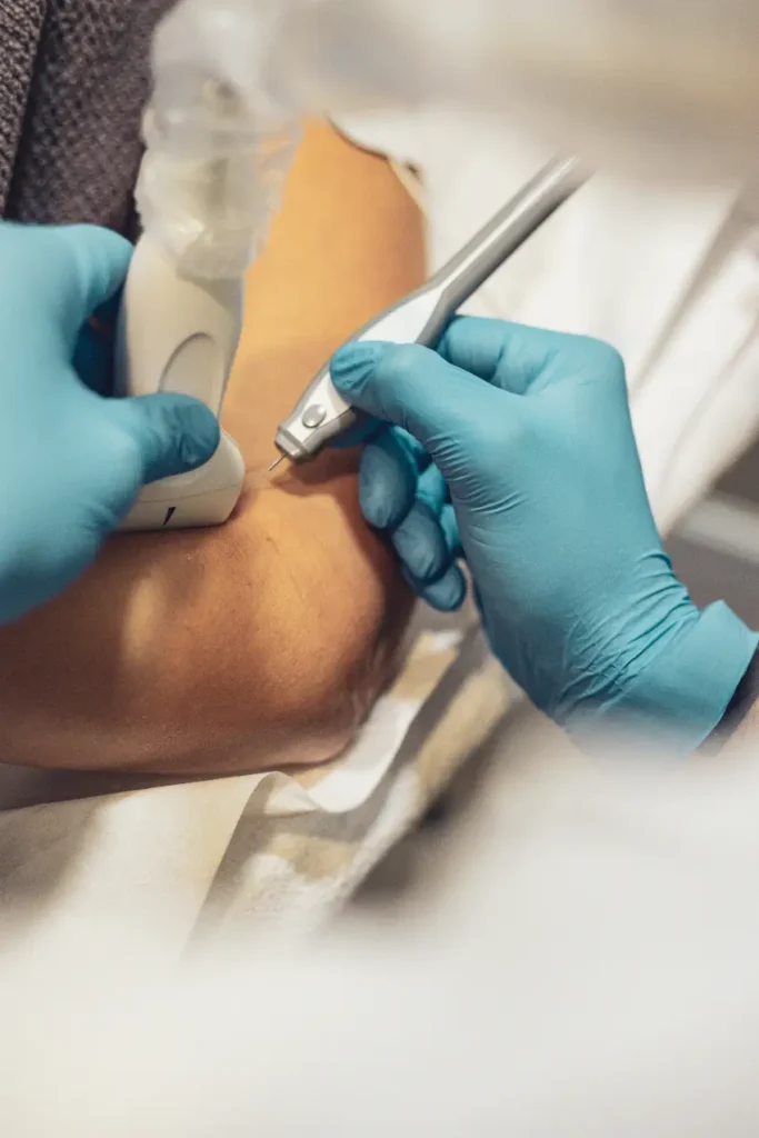 Con la ayuda del ecógrafo, se introduce una aguja muy fina directamente en la zona dañada. Esta aguja va conectada a un dispositivo que aplica una corriente controlada que provoca una pequeña respuesta inflamatoria local (totalmente segura), que estimula la regeneración del tejido dañado. - Control constante del paciente